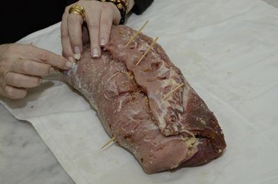 – Com este recheio pronto, colocar no centro do lombo. Agora vamos fechá-lo, enrolando como um rocambole, auxiliando com o próprio pano de prato. O recheio não poderá sair pelas extremidades.