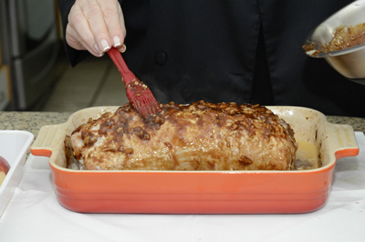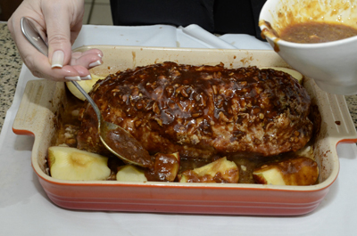 13 – Depois de pincelado, o lombinho volta para o forno, lembrando que é a hora de colocar as 2(duas) maçãs cortadas em quatro neste mesmo refratário