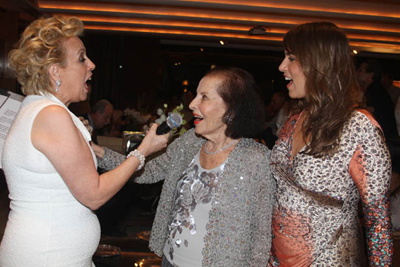 Maria Célia espicha o microfone para sua “madrinha” Bertha Mendes de Souza e a filha, Fernanda Londres