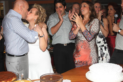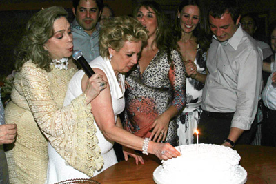 Maria Inês Nogueira, a grande combustível da animação da festa, e Maria Célia, na hora do bolo, com Ivan e Fernanda Londres, Juliana e Roberto Moraes