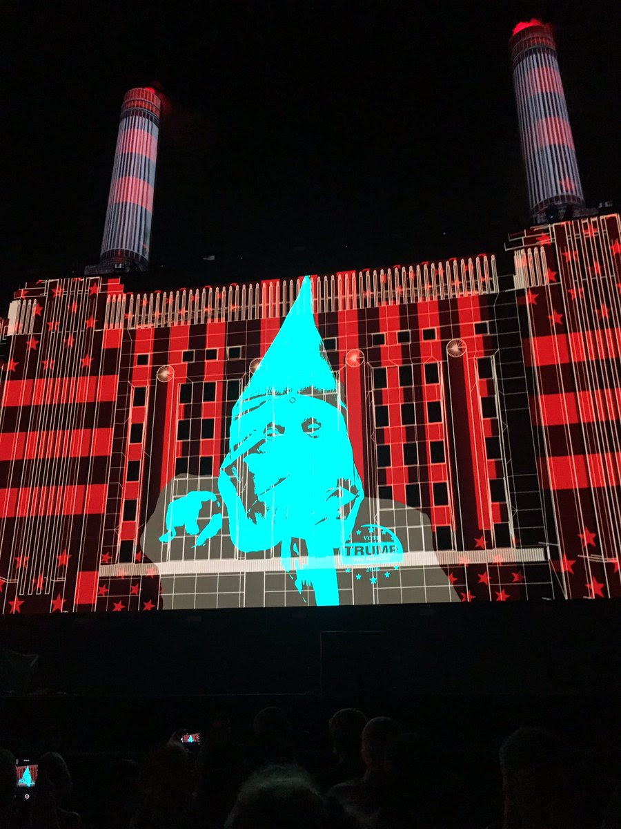Enquanto cantavam sua famosa The Wall, crianças mexicanas eram vistas no palco vestidas com camisetas com a inscrição “Derrube o muro”,ao mesmo tempo em que Roger discursava que “não há muros para separar irmãos” e um porco inflável sobrevoava a platéia com xingamentos de “Trump porco (chauvinista)” mais a frase “fuck Trump e seu muro”, enquanto eram projetadas num “muro” várias imagens do republicano, com legendas ofensivas tais como “mentiroso”, “racista”, “sexista” e uma diferenciada: “pentejo“, que os jornais americanos não traduziram. mas é a nosso popular “pentelho”, que entre os mexicanos tem conotação mais pesada… Trump foi promovido à Geni do rock mundial!
