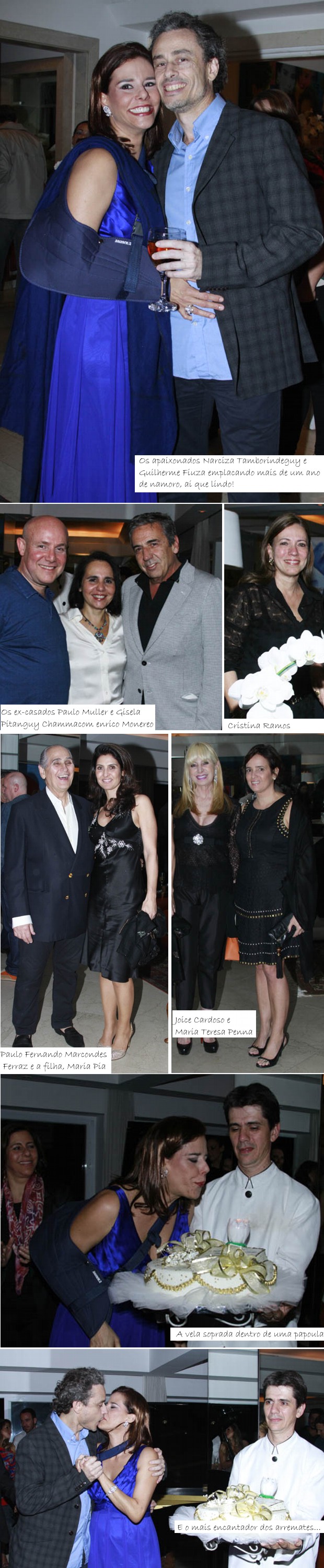 Quando tocaram as doze badaladas, quem chegou? O Boni! Com sua Lou de Oliveira, e dançaram muito. Na hora dos parabéns, bolo com champagne ao coro do “com quem será que a Narciza vai casar?”. E o Guilherme Fiúza quer, gente, viva!…