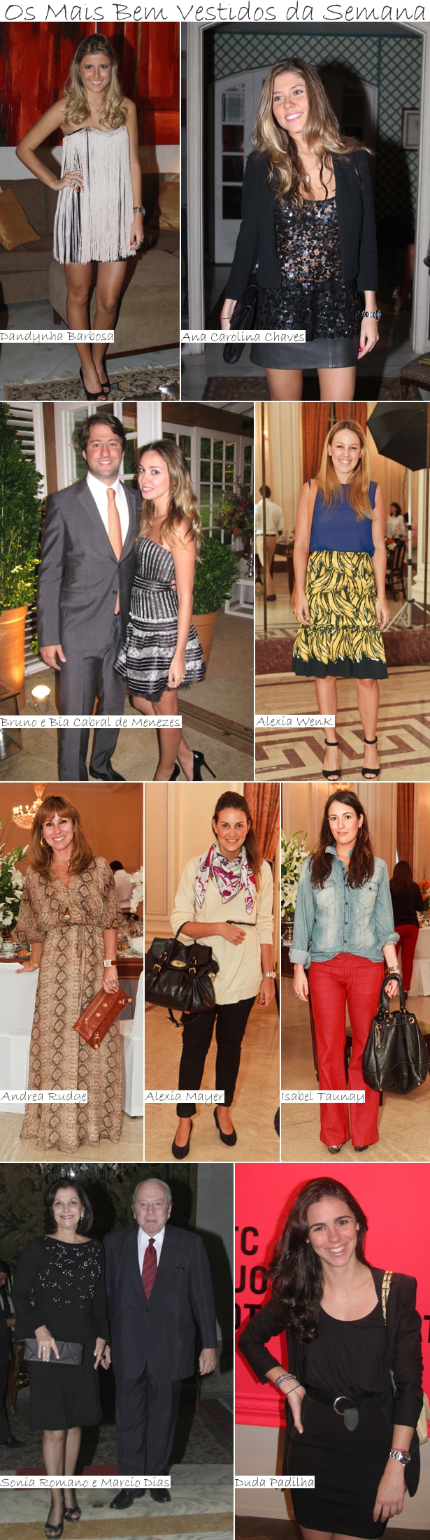 Legendas: Dandynha Barbosa e Ana Carolina Chaves no aniversário de Dandynha; Bruno e Bia Cabral de Menezes no casamento de Eliane Teixeira e Carlos Eduardo Teixeira Ramos, na fazenda do noivo, no Brejal; Alexia Wenk, Andrea Rudge, Alexia Mayer e Isabel Taunay no Special Tea da Nag Nag, no Copacabana Palace; Sonia Romano e Marcio Dias, no jantar em homenagem à princesa Michael de Kent, no palacete Julieta de Serpa; Duda Padilha, Luis Antonio Campos, Fernando Barrozo do Amaral, Costanza Pascolato, Vanda Klabin e Fernanda Feitosa, na abertura da SP-Arte, no pavilhão da Bienal, em São Paulo…